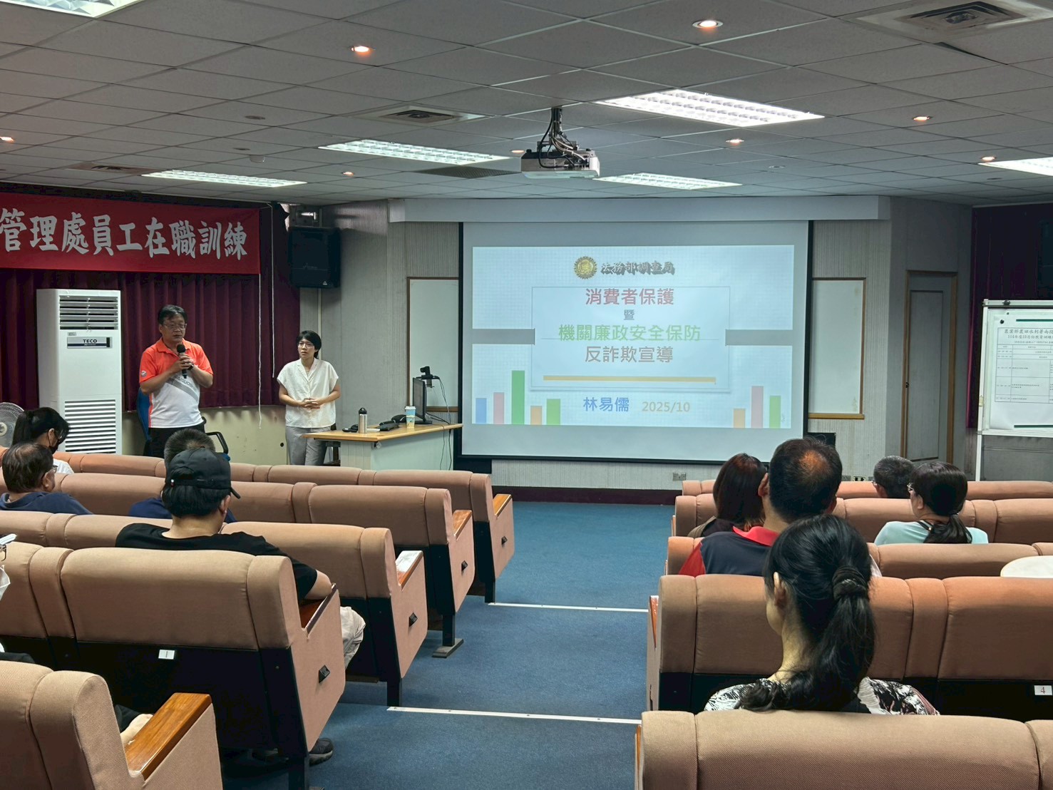 農田水利署南投管理處於114年10月15及17日舉行教育訓練,邀請法務部調查局臺中市調查處林易儒調查官講授「消費者保護暨機關廉政安全保防反詐欺宣導」。林調查官講述目前常見的不動產詐欺案件,可透過稅籍異動即時通及地籍異動即時通等功能申請,為己身財產提升防護,另外常見詐騙樣態包括手機投創群組、一頁式購物廣告及假借公機關名義給予詐騙連結等等,建議可至官網或165防詐專線查詢。